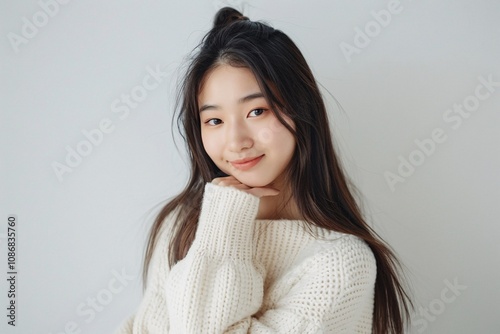 Beautiful Asian Chinese woman showcasing perfect makeup and hairstyle on white background