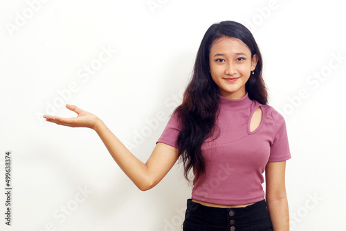 Beautiful asian girl presenting something beside her. Isolated on white background with copyspace