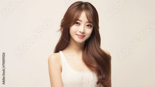 Beautiful Asian Taiwanese Woman Portrait Studio Photo Profile Picture Young Model with Long Hair for Fashion Beauty Skincare Haircare Products on Light Solid Color Background 16:9
