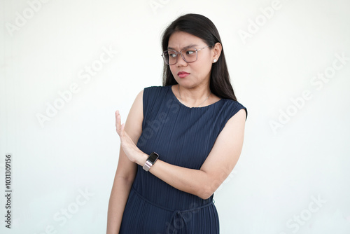beautiful Asian woman extends her hand in a stopping gesture, signaling rejection against a white background