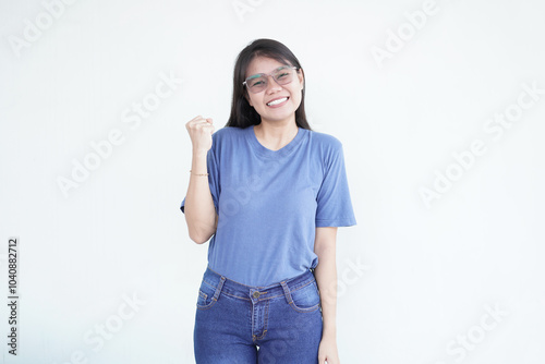 Beautiful Asian woman flashes a bright smile, raising her fists in a triumphant 'yes' victory gesture against a white background