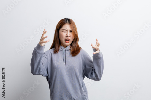 Beautiful Asian woman gesturing for advertisement editing on isolated background, portrait concept used for advertisement and signage, isolated over white background, copy space.