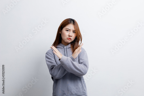 Beautiful Asian woman gesturing for advertisement editing on isolated background, portrait concept used for advertisement and signage, isolated over white background, copy space.