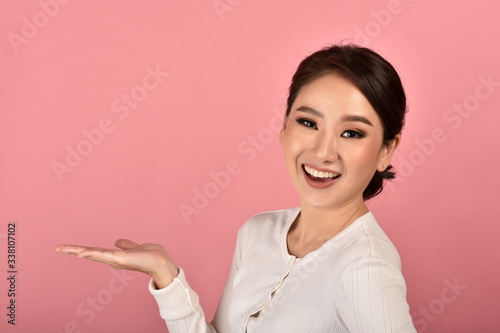 Beautiful asian woman hand open presenting product for mock-up advertising on pink background, Portrait of happy smiling girl with copy space.