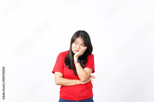 beautiful Asian woman looks tired and sleepy, leaning on one palm, set against a white background