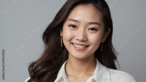 Beautiful Asian woman of middle age or young age posing for beauty portrait. Pretty mature adult lady model from Asia looking at camera smiling on background advertising with copy space