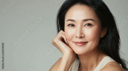 Beautiful Asian woman of middle age posing for beauty portrait. Pretty mature adult lady model from Asia looking at camera smiling on background advertising anti aging skin care. Face skincare