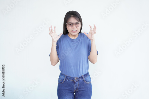 Beautiful Asian woman shows an angry gesture, her brows furrowed and fists clenched, expressing frustration against a white background