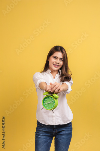 Beautiful Asian woman standing and hold a green alarm clock over yellow background smiling happily.