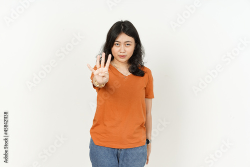 Beautiful Asian Woman Wearing Orange Color T-Shirt showing four finger Isolated On White Background