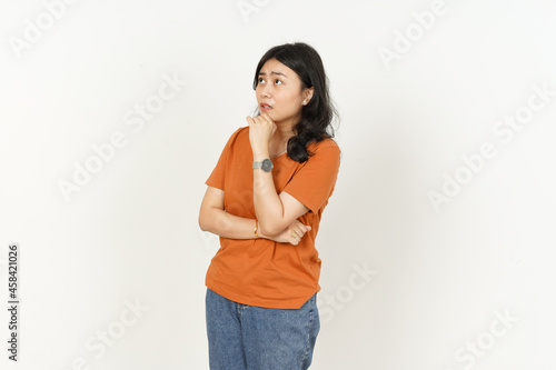 Beautiful Asian Woman Wearing Orange Color T-Shirt Thinking gesture Isolated On White Background