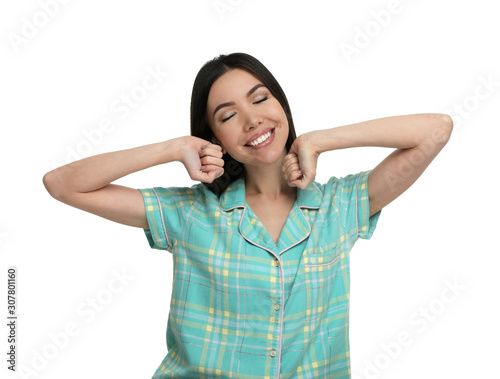 Beautiful Asian woman wearing pajamas on white background. Bedtime
