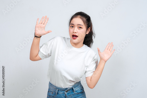 beautiful Asian woman with a surprised and excited expression, hands raised, and mouth open wide