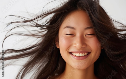 Beautiful Asian Woman with Flowing Hair Smiling in the Wind