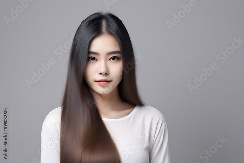 Beautiful Asian Woman with Long Black Hair and White Shirt