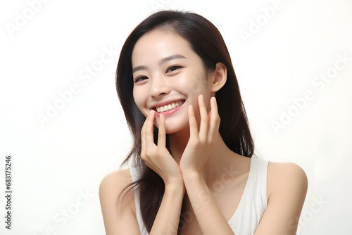 Beautiful Asian Woman with Long Hair Smiling and Touching Her Face in a Serene and Confident Manner. Generative AI