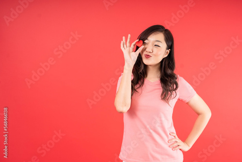 Beautiful Asian woman with pink shirt holding small little heart isolated over red background. Valentines Day concept. Feel joy and romance