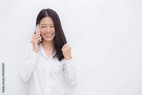 Beautiful asian young businesswoman excited and glad of success taking mobile phone on cement background, career freelance business concept.