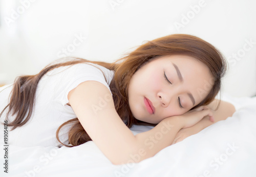 Beautiful asian young woman sleeping lying in bed with head on pillow comfortable and happy. girl with relax for health concept.
