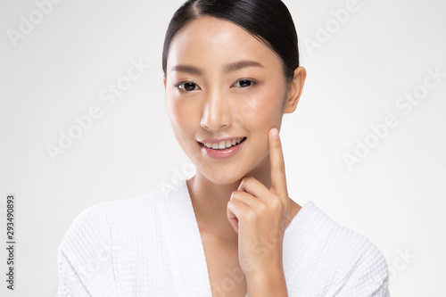 Beautiful Asian young woman touching soft cheek smile with clean and fresh skin Happiness and cheerful with positive emotional,isolated on white background,Beauty and Cosmetics Concept