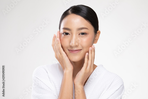 Beautiful Asian young woman touching soft cheek smile with clean and fresh skin Happiness and cheerful with positive emotional,isolated on white background,Beauty and Cosmetics Concept