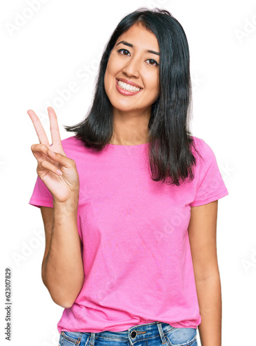 Beautiful asian young woman wearing casual pink t shirt showing and pointing up with fingers number two while smiling confident and happy.