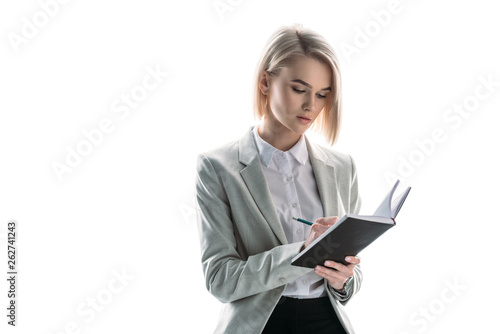 beautiful, attentive businesswoman writing in notebook isolated on white