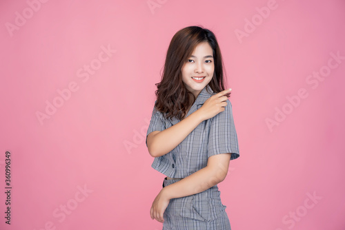 Beautiful attractive Asian businesswoman smiling finger pointing, entrepreneur model posing pink isolated background, wearing formal fashion clothing, worker employee business finance entertainer