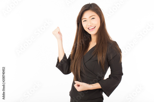 Beautiful Attractive Asian young business woman in suit smile and celebrating feeling so happiness and cheerful,Isolated on white background,Business Concept
