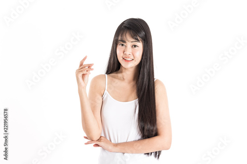 Beautiful Attractive Charming Asian woman with long hair smile with healthy and fresh skin feeling so happiness and cheerful,Isolated on white background,Beauty Concept