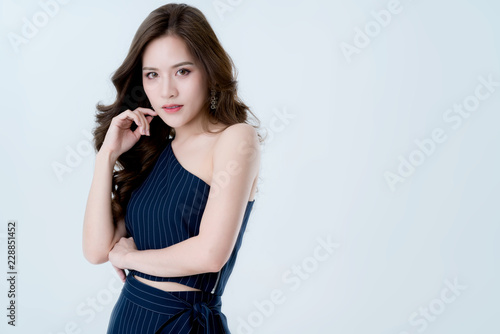 beautiful attractive elegance asian woman in blue dress hand touch face model pose on studio photo shoot isolate white background