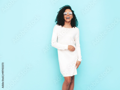 Beautiful black woman with afro curls hairstyle. Smiling model dressed in white summer dress. Sexy carefree female posing near blue wall in studio. Tanned and cheerful in sunglasses. Isolated
