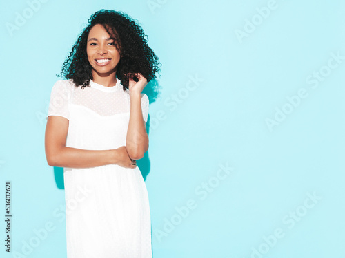 Beautiful black woman with afro curls hairstyle. Smiling model dressed in white summer dress. Sexy carefree female posing near blue wall in studio. Tanned and cheerful. Isolated