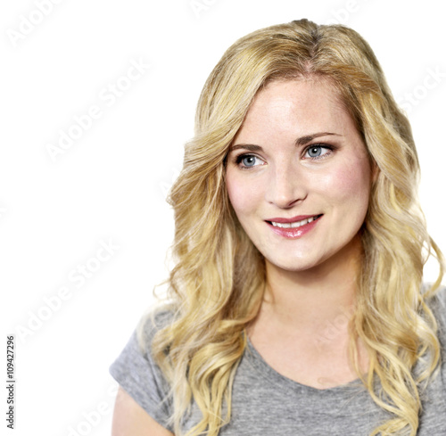 Beautiful blond woman smiling. Positive Emotions. Young woman with copy space, isolated on white background.