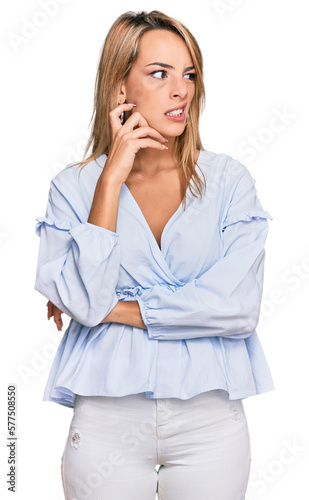 Beautiful blonde business woman wearing casual clothes serious face thinking about question with hand on chin, thoughtful about confusing idea