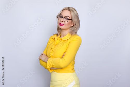 Beautiful blonde business woman wearring eyeglasses and yellow suit over white background in studio