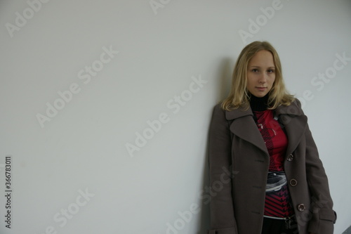 Beautiful blonde girl in the city. Sunny day. Business woman
