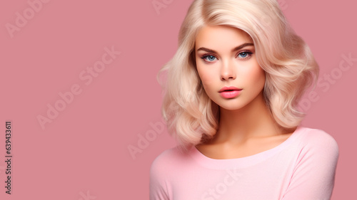 Beautiful blonde with blue eyes on pink background with copy space