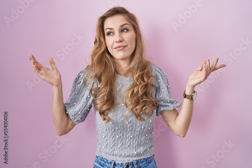 Beautiful blonde woman standing over pink background clueless and confused expression with arms and hands raised. doubt concept.