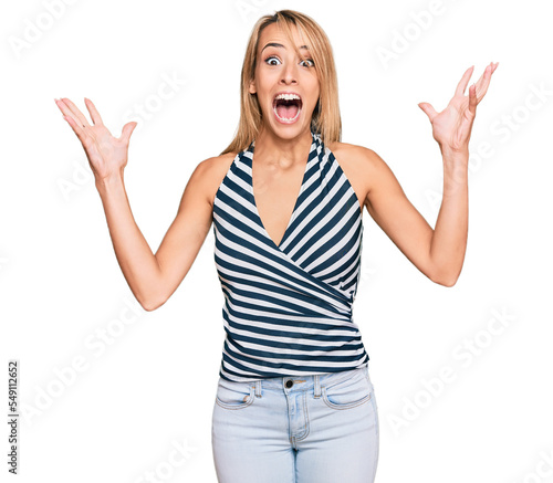 Beautiful blonde woman wearing casual clothes celebrating victory with happy smile and winner expression with raised hands