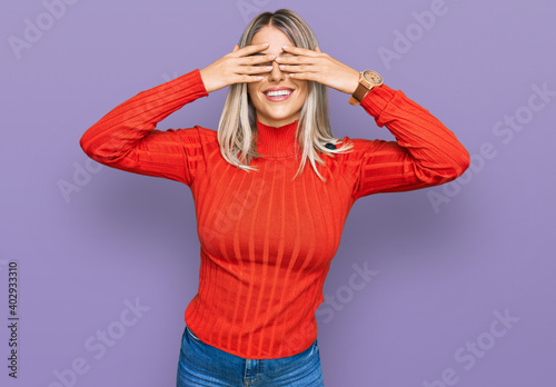 Beautiful blonde woman wearing casual clothes covering eyes with hands smiling cheerful and funny. blind concept.