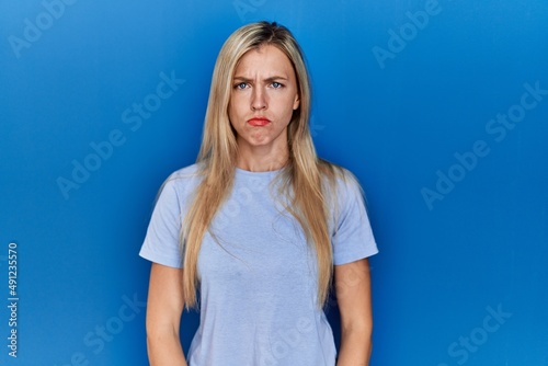 Beautiful blonde woman wearing casual t shirt over blue background skeptic and nervous, frowning upset because of problem. negative person.
