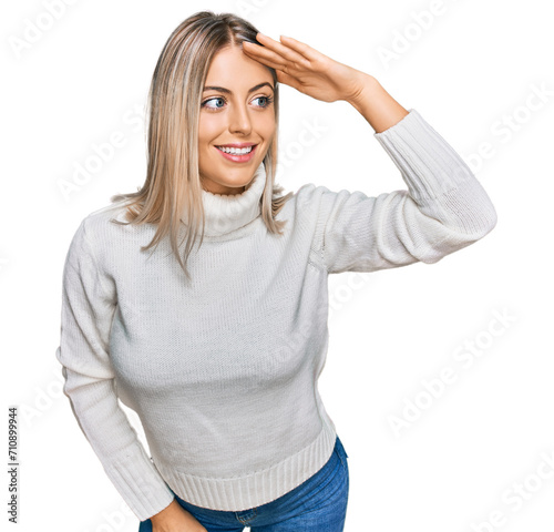 Beautiful blonde woman wearing casual turtleneck sweater very happy and smiling looking far away with hand over head. searching concept.