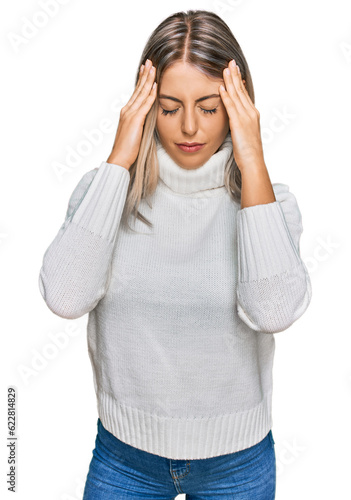 Beautiful blonde woman wearing casual turtleneck sweater with hand on head for pain in head because stress. suffering migraine.