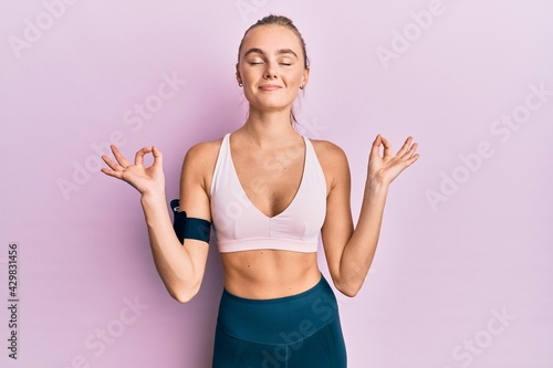 Beautiful blonde woman wearing sportswear and arm band relax and smiling with eyes closed doing meditation gesture with fingers. yoga concept.