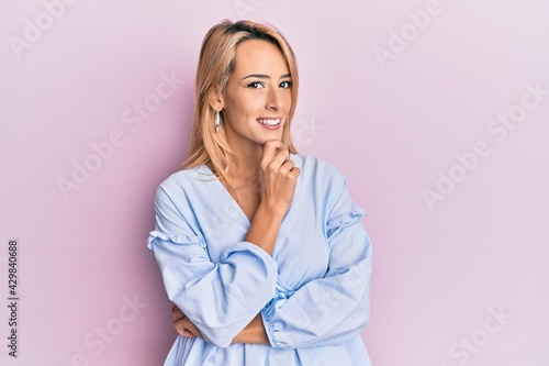 Beautiful blonde woman wearing summer dress smiling looking confident at the camera with crossed arms and hand on chin. thinking positive.