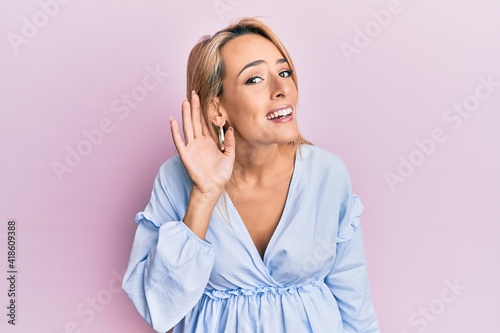 Beautiful blonde woman wearing summer dress smiling with hand over ear listening and hearing to rumor or gossip. deafness concept.