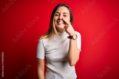 Beautiful blonde woman with blue eyes wearing casual white t-shirt over red background Pointing with hand finger to face and nose, smiling cheerful. Beauty concept