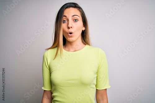 Beautiful blonde woman with blue eyes wearing green casual t-shirt over white background afraid and shocked with surprise expression, fear and excited face.