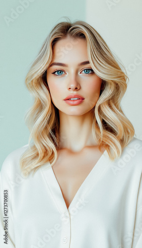 Beautiful blonde woman with soft waves in a white blouse posing against a bright backdrop.